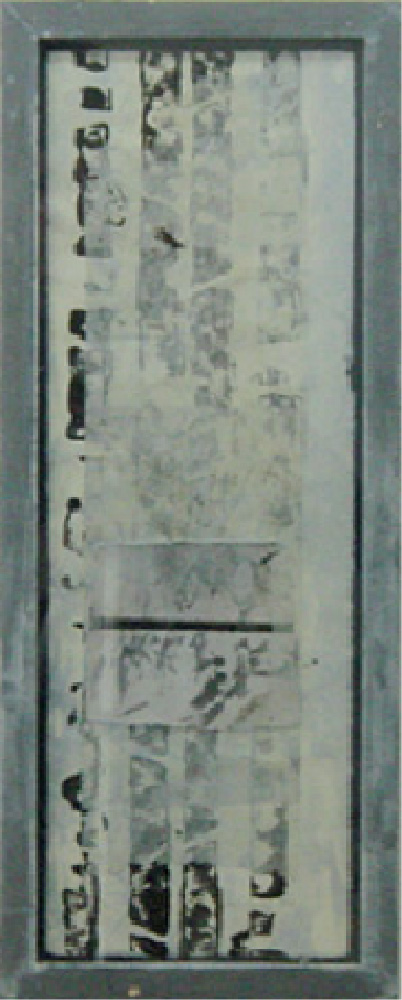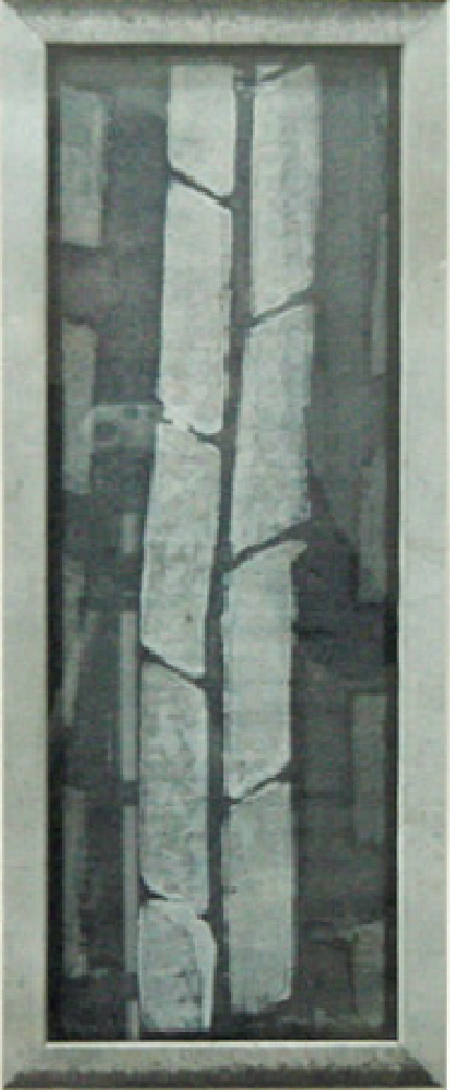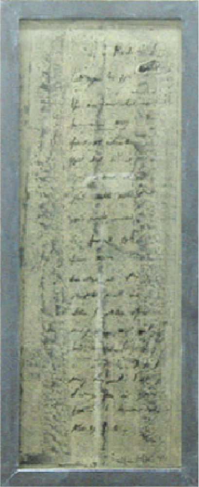 Spuren von verschiedenen Traktorreifen und einer Handschrift oder einer Fotografie, gefunden auf dem Land des Bauern. Die Bilder sind alle mit Zinkblech einer alten Regenrinne gerahmt.